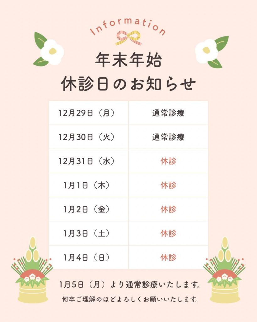 年明けは、1月5日より通常診療致します。何卒ご理解のほどよろしくお願い致します。